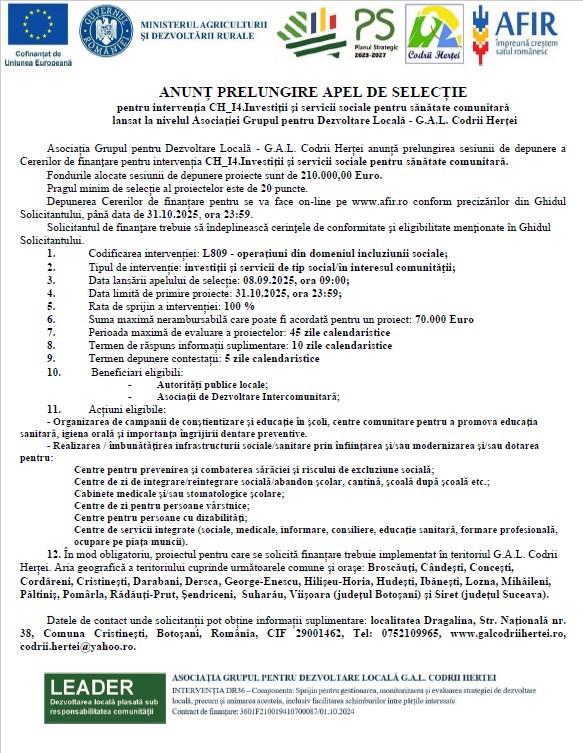 ANUNȚ PRELUNGIRE APEL DE SELECȚIE pentru intervenția CH_I4.Investiții și servicii sociale pentru sănătate comunitară lansat la nivelul Asociației Grupul pentru Dezvoltare Locală - G.A.L. Codrii Herței